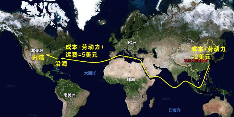 这个时候,中国的商品对美国商品还是有比较优势,但是它却不能完全占有美国的市场了,因为出口到美国沿海地区是9美元,但是如果再运输到美国内地那么还需要增加运输费用等,就超过10美元了,那样美国内地的同类商品就能活下来了——不至于整个国家的市场都被中国占领。