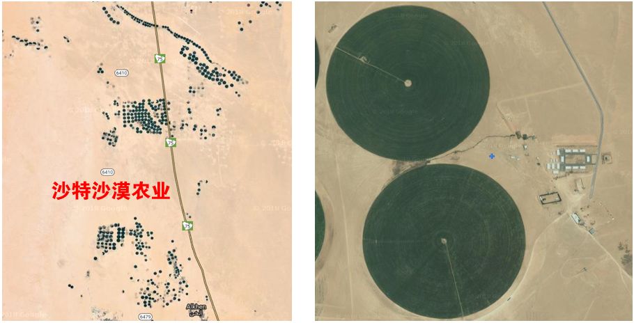 大家看看下面的图,这就是沙特在沙漠中建立的农业基地。