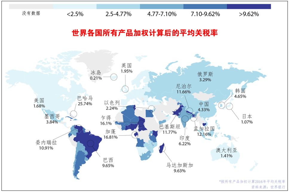 下面的图是2016年世界各国的平均关税:其中冰岛是最低的,只有0.21%,因为冰岛非常的小,只有32万人,无法支撑工业,而且冰岛靠近北极,而且受暖洋流影响根本不适合发展农业(冷热交替,气候不冷,但是一年四季随时都可能下雪),由于自己无法生产,所以也就无所谓保护,所以它的关税是最低的,并不是说冰岛真的就那么大方,任由世界其它国家进入商品进入冰岛(冰岛主要靠渔业和金融业生存)。