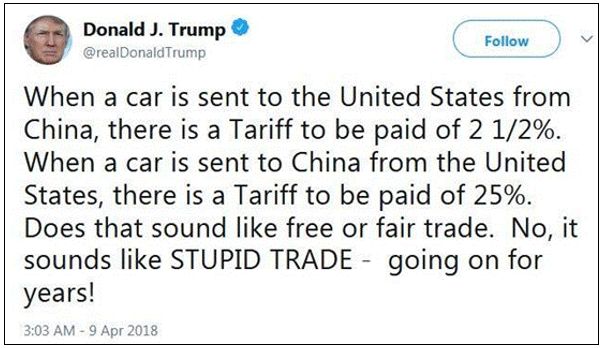 比如特朗普曾经就拿“中国汽车进入美国只要交2.5%的关税,美国汽车进入中国却要交25%的关税”来显示美国的“无辜”和“吃亏”。