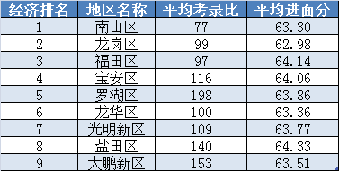 经济发达程度前二的南山区和龙岗区,平均考录比和平均进面分数反而是倒二。福田区与罗湖区的分数稍微配得上他们的发展水平。而连地铁基本没通的盐田区,居然是最难考的。