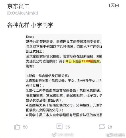 今天微博上有个大新闻,京东以“管理需要”为名,要求员工梳理亲属及同学关系,不仅要求填写情侣关系以及三代以内的旁系亲属,甚至从小学起的同学也必须提交,搞得网上议论纷纷。