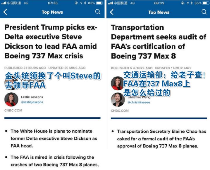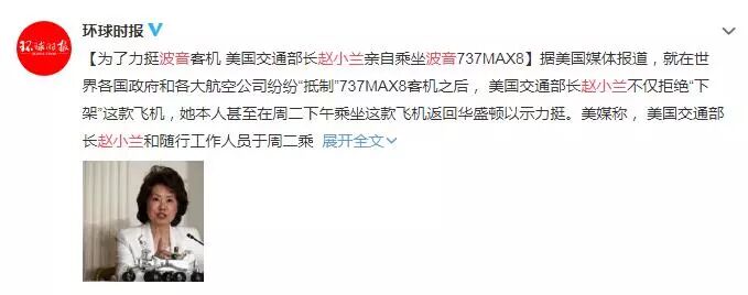 美国交通部长赵小兰(特朗普政府唯一华裔阁员)也刻意以搭乘波音737MAX8飞机执飞的航班飞往华盛顿的方式力挺波音,希望借此消除世界对波音737MAX8飞机安全性的质疑。
