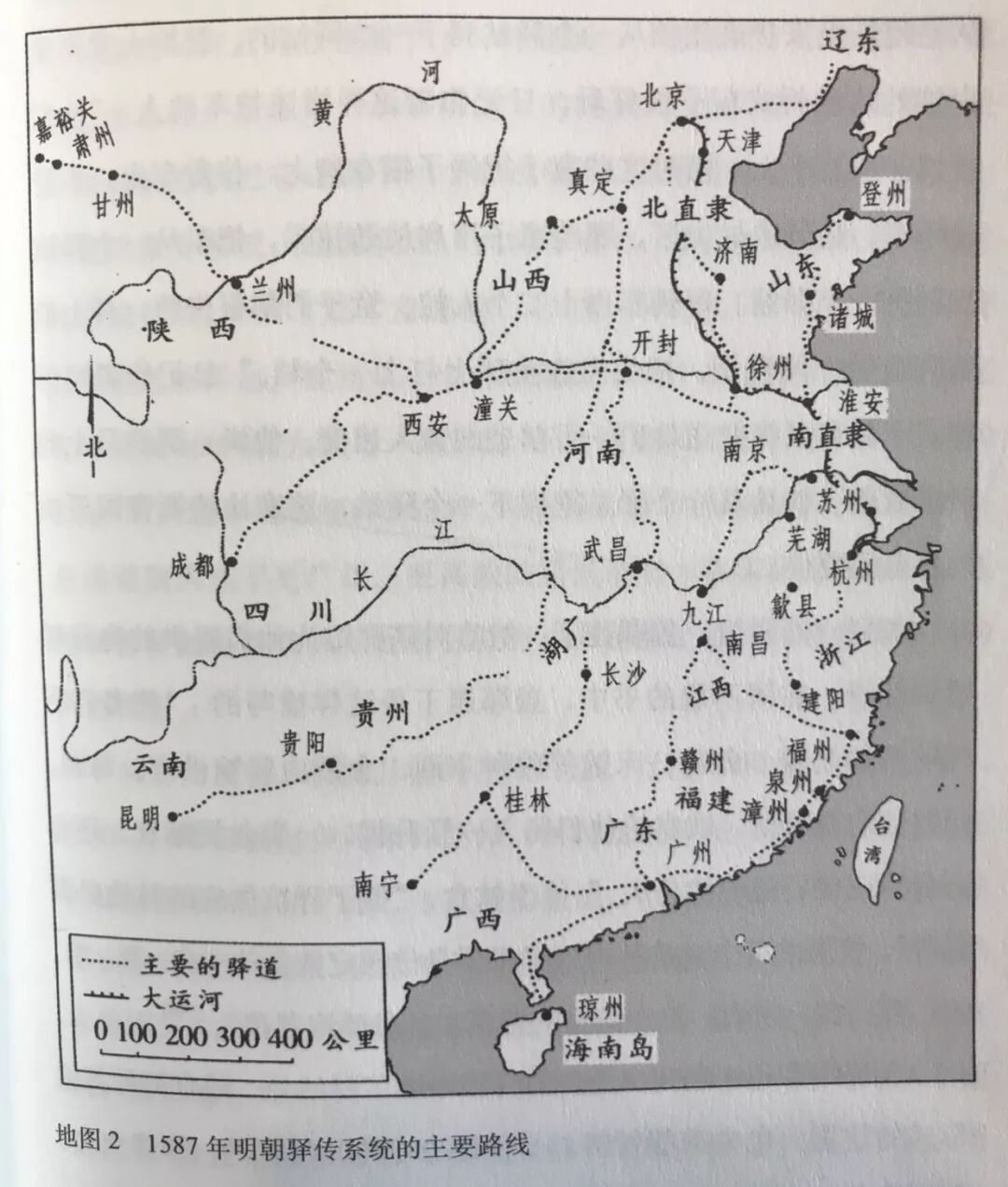 汉代的公文系统基本奠定了后世王朝的模式,无论唐宋元明清,都是如此。据《大唐六典》记载,最盛时大唐有1639 个驿站,专门从事驿务的人员共二万多人。到了明代,为了政令通达,明朝建立了当时世界上最大的“通讯”系统,这个系统由三部分组成:驿传(信使)、急递(邮政)和递运(运输)。围绕北京,这个庞大的网络共有1936个驿站,驿道总长143700里(合84200公里),每隔60或80里就设一个驿站。