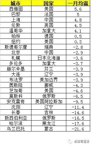 中国最北的省会哈尔滨位于北纬46度,法国的巴黎是北纬48度,英国的伦敦北纬51度,芬兰的赫尔辛基北纬60度。哈尔滨虽然看起来纬度低一些,但一月均温却比它们低上15-20多度。