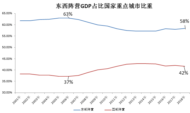 2006年,东部阵营的体量,占36个城市GDP总和的63%,比西部整整高出26%。后来这个差距逐步收缩到了16%。换句话说,内陆的重点城市,慢慢地追上了沿海发达地区,将东部的靠海优势砍得七零八落。