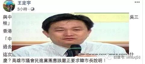 一向鼓吹“台独”的民进党深绿“立委”王定宇也在脸书上发文,要求“高雄市议会民进党党团应该严正要求韩市长说明”。