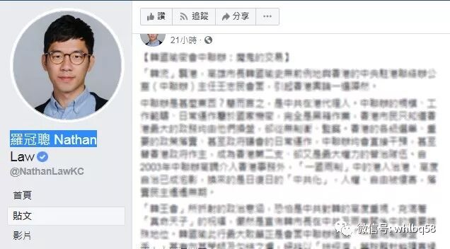 经常窜到台湾与“台独”势力眉来眼去、沆瀣一气的“港独”组织香港众志,其主席罗冠聪今天也在脸书上发文,声称“韩此行变成‘一国两制操盘手’,绝非‘拚经济’”。