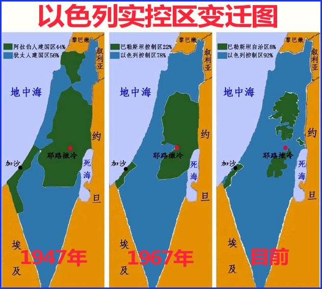 一个是在以色列建国时就犬牙相错的巴勒斯坦人,因为你中有我,我中有你,以色列坚持绝不退让、绝不妥协的原则。从下面以色列实际控制区变迁图可以清晰地看出,巴勒斯坦人的建国梦不仅没有得到国际社会的一致支持,而且其自治范围(绿色区域)不断缩小,甚至加沙濒临地中海沿岸,都已经有了大量以色列人定居点。按过去几十年的趋势演变下去,或许再过百年,巴勒斯坦国不复存在,巴勒斯坦人建国的梦想将彻底破灭。这也是许多巴勒斯坦人非常焦虑,激进的反以活动层出不穷的原因。