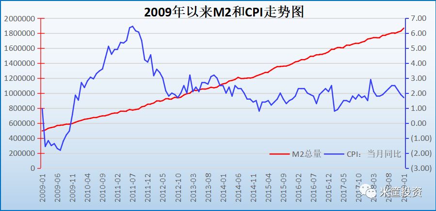 这是一张2009年以来M2(可通俗的理解为市场中的钱)数量和CPI(可通俗的理解为物价涨幅)的走势图。