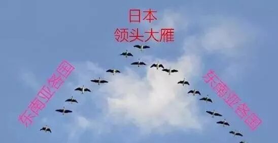 率先实现工业化的日本依次把成熟了的或者具有潜在比较劣势的产业转移到“亚洲四小龙”,后者又将其成熟的产业依次转移到“亚洲四小虎”,在他们之间形成了“技术密集与高附加值产业-资本技术密集产业-劳动密集型产业”的阶梯式产业分工体系,形成一幅以日本为“领头雁”的东亚经济发展的雁行图景。