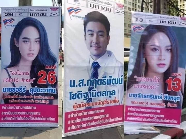 这张宣传板上的候选人性别,从左到右分别是男、女、男,很有泰国特色。