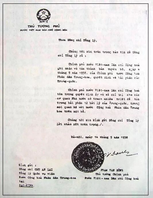 ▲ 越南总理范文同承认中国对南海主权的国书原件