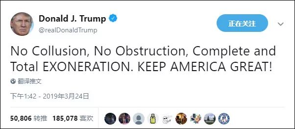 没有勾结,没有干预司法,完全被证无罪,继续让美国伟大!