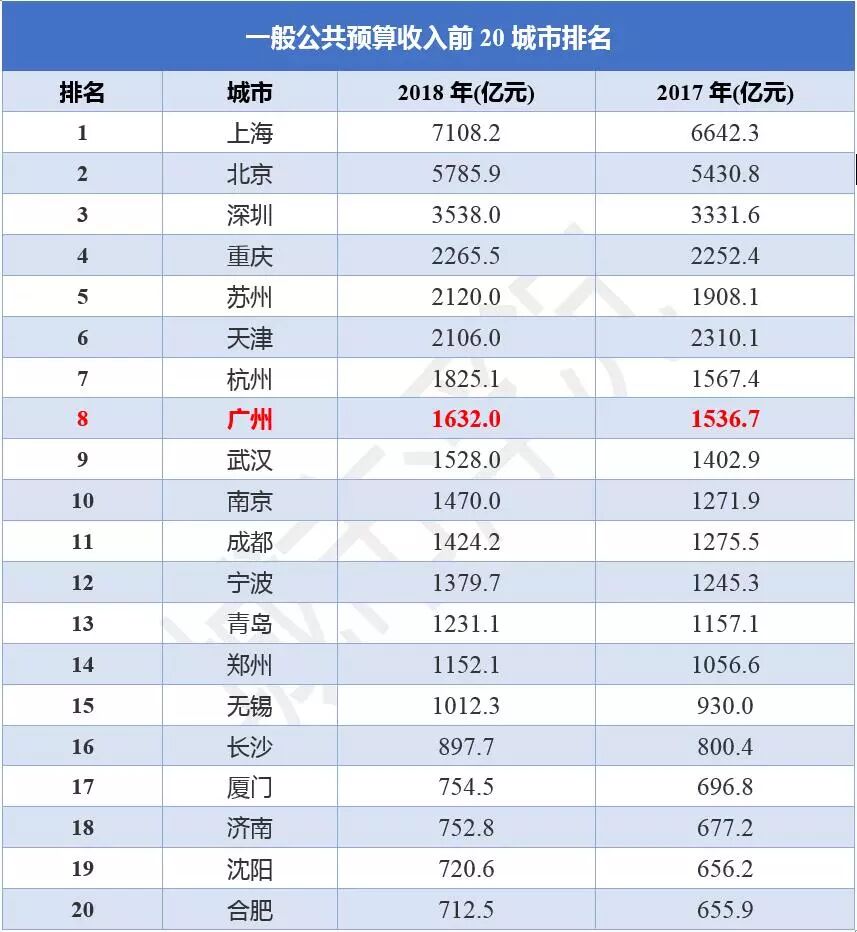 一般公共预算收入是衡量一个城市的财政支配实力。从公布的数据看,广州2018年一般公共预算收入1632亿元,位列全国第8。