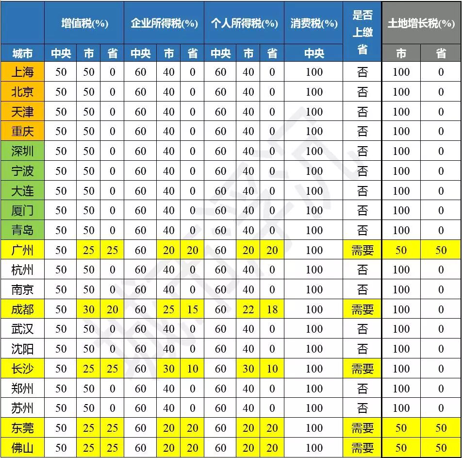 上表可以看出,广州属于三级财政,除了上缴中央的税收外,增值税需要上缴省25%,企业所得税和个人所得税均需要上缴省20%,“四税”之外的土地增值税还要上缴省50%。