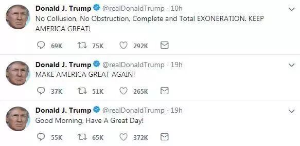 这一消息让特朗普非常兴奋,当天来了个三连推来表达自己的心情,并通过推特来引导舆论。