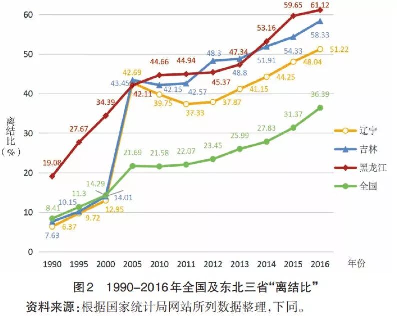 而东北地区长期低生育率,是导致离结比长期处于全国榜首这一现象的区域内独特原因之一。低生育率导致东北地区婚龄人口中独生子女比例更高,婚姻包容度降低。近年来东北地区的生育率一直在全国倒数,2010年东北三省总和生育率分别为黑龙江省0.74、吉林省0.75、辽宁省0.76,不及总和生育率最高的地区广西壮族自治区的总和生育率1.79的1/2。