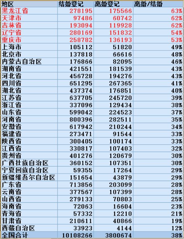 从图表可见,东三省在各省离婚结婚比统计中,黑龙江省的离婚结婚比高达63%,吉林和辽宁分别是62%和54%,远高于平均水平的38%。