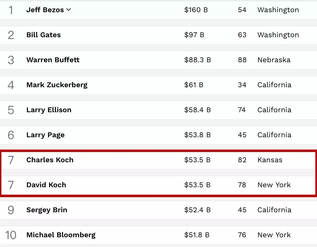 ◆华尔街人士评论,如果科氏工业上市,科氏兄弟必将超越贝索斯成为新的世界首富。