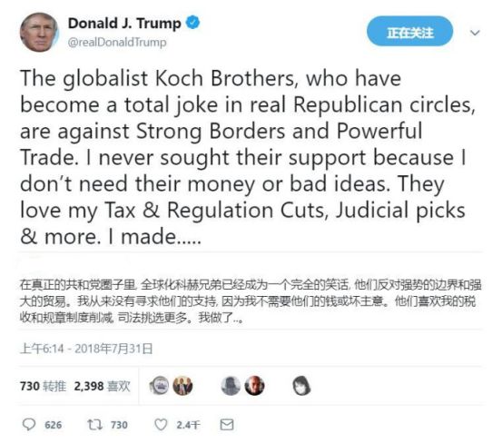 特朗普也不甘示弱,在推特上反击,称科氏兄弟“已经成为一个完全的笑话”,并表示,自己“不需要他们的钱或坏主意”。