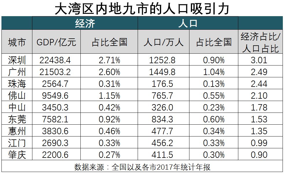 根据我们的统计,深圳、广州、珠海、佛山、中山、东莞、惠州的吸引力数值分别为3、2.5、2.4、2.1、1.8、1.5、1.3。大湾区内地九市,有七个地方具有人口虹吸力。