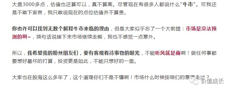太多的人总是自责自己为什么不“入袋为安”。可是大家却忘了,这个安也是分情况的啊!你在牛市中后期,那叫入袋为安。你现在3000点那叫什么入袋为安?那叫傻!