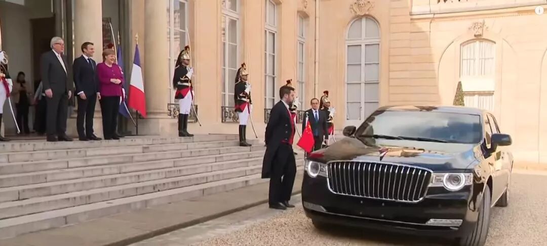 台阶上站着出门迎接的三个人分别是:中间法国总统马克龙,左边欧盟委员会主席容克,德国总理默克尔。三人是欧洲政界的翘楚,然而三人却并排迎接中国元首,这就是大国的实力!特别是默克尔冲到法国求见,更是实力的充分体现!