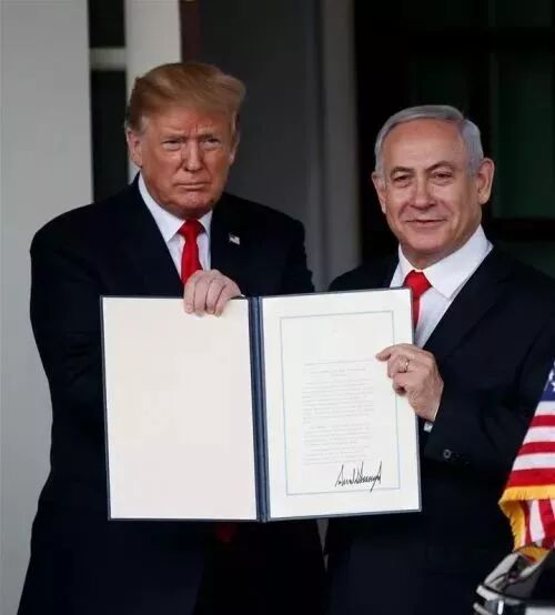 当地时间3月25日,特朗普在白宫与以色列总理内塔尼亚胡举行会谈,并签署公告,正式承认以色列对1967年从叙利亚手中占领的戈兰高地享有主权。