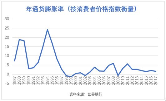 1987年至今过去30年,来看看我国的通胀记录,官方披露的年通胀复合增长率高达3.75%,用世界银行公布的数据计算年复合增长率则要更高些,达到5.19%,大概相当于1987年的1元钱等同于2017年4.57元钱的购买力,居民个体的感受因为房价等资产价格的飞升要更糟糕一些。这种通胀之下,早把上世纪八九十年的“息爷”们的财富清洗得干干净净,那时候指望着几十万的存款过好一生的愿望被证明实在太天真了。