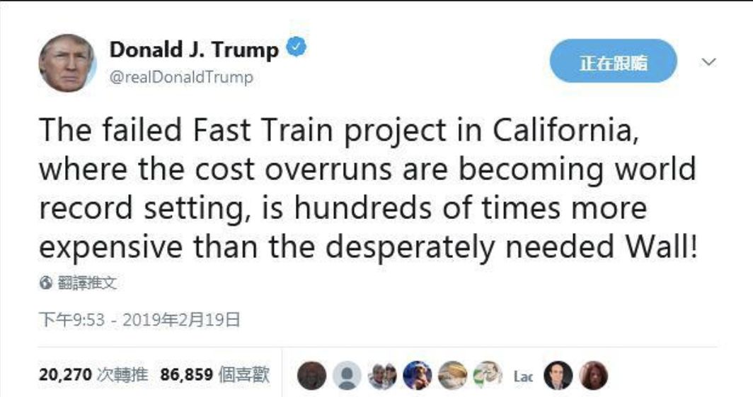 上图:2019年2月,特朗普在推特上攻击称美国最大高铁项目是”世界级烂尾工程“,表示”还不如把钱给他建边境墙“。