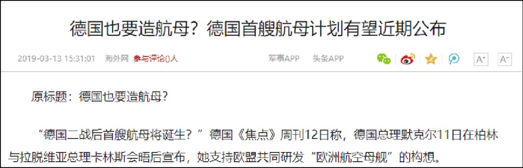 德国《焦点》周刊12日称,德国总理默克尔11日在柏林与拉脱维亚总理卡林斯会晤后宣布,她支持欧盟共同研发“欧洲航空母舰”的构想。