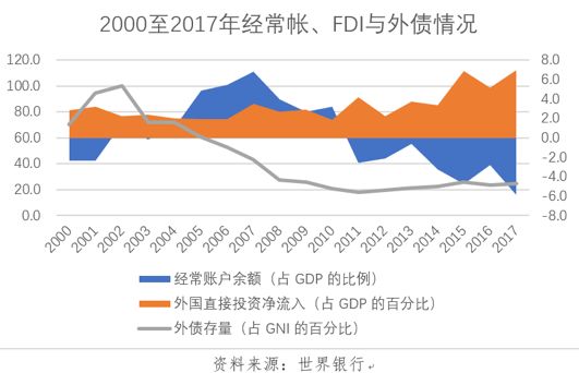 民主化进程带来了经济改善,其中一个重要表现就是外债规模受到控制,慢慢回落至更可持续的水平,2017年外债占国民总收入的占比为24.5%,总储备可支付2.93个月的进口。但外债激增造成经常账户赤字规模不断扩大,至2017年经常账户赤字已经占到GDP的5.9%,目前主要依赖FDI净流入来予以平衡。但缅币不能自由兑换,这两个问题又构成了国民经济脆弱性的另一环。