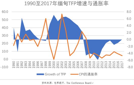 2008年缅甸制宪完成后,历史上的恶性通货膨胀得到了有效的控制,但仍处于高水平。此前,每年动辄两位数的恶性通货膨胀侵蚀着底层劳动人民的财富。而且缅甸的经济增长质量不高,隐含调整的风险。据世界大型企业联合会测算,缅甸自2008年以来,全要素生产率的增速为负(2017年为零)。这意味着近10年的经济增长中,对资本、劳动力等要素投入数量的依赖过大,而产出效率不高,这构成了未来经济调整的隐患。