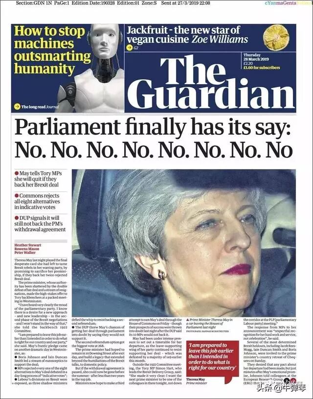 英国《卫报》的头版大标题就是:国会最终说话了:不、不、不、不、不、不、不、不。