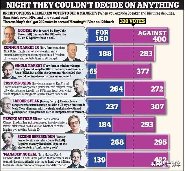 梅姨的两个脱欧协议,都被否决了。3月27日,英国国会又对8个替代方案投票,全部被否决。