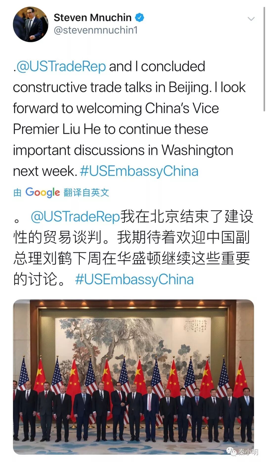稍早,美国财政部长姆努钦也在其推特账号上发布推文,称本轮贸易谈判结束,并期待下周刘鹤副总理前往华盛顿继续磋商。姆努钦的推特截图如下: