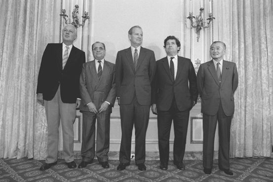 1985年,美国、日本、法国、英国和联邦德国的财政部长、央行行长(G5)在纽约广场饭店签下了著名的《广场协议》,作为制造业强国的日本被迫接受了日元大幅升值的条款。1987年,在《广场协议》的基础上,上述五国又与意大利、加拿大(G7)签订了《卢浮宫协定》,美元和日欧各国货币币值趋于稳定,同时美国政府大幅削减财政赤字,世界各国的经济形势开始趋于稳定。