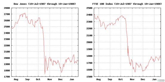 ▲1987年7月19日-1988年1月19日美国道琼斯指数(左)与伦敦FTSE指数(右)走势图
