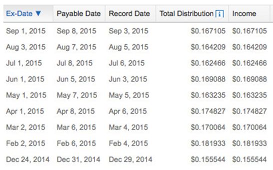 ▲IEF(一家以国债为主要投资对象的ETF)2014年12月至2015年9月的分红记录