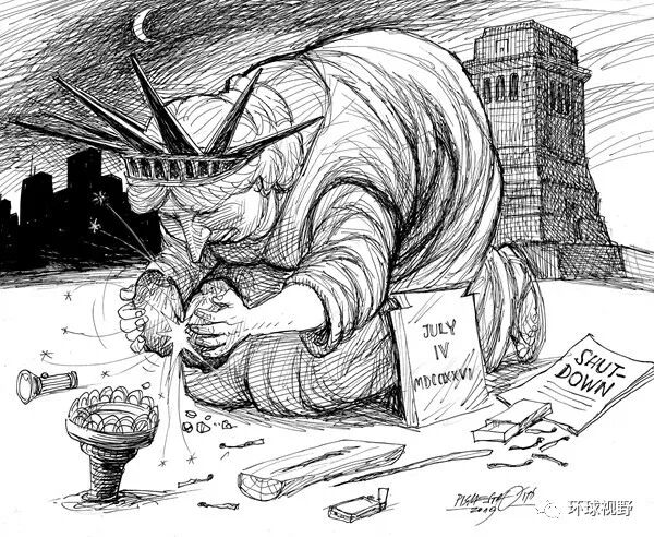 ▲自由女神的火炬熄灭 原载美国卡格尔漫画网
