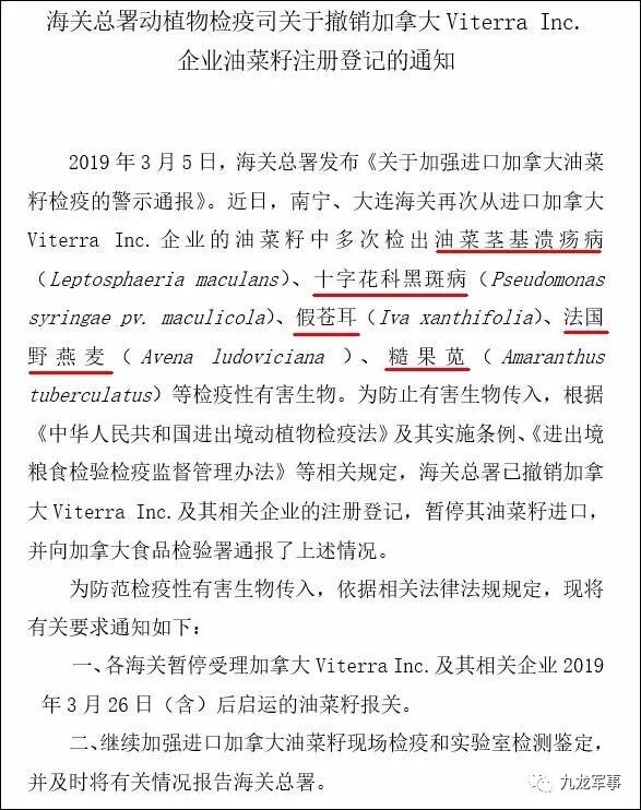 3月26,中国海关总署在公布的关于撤销第二家加拿大企业对华出口油菜籽的许可证的通知中也说的很清楚,从加拿大进口的油菜籽中检测出的有害生物也列举的很清楚。