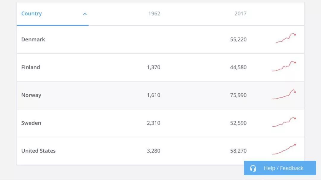 看收入表,瑞典目前排在全世界第12,可我们要知道的是,在1975年的时候,瑞典可是排在世界第四的。这就好像有个人炒股炒成百万富翁,有人问他秘诀,他说:我原来是千万富翁。
