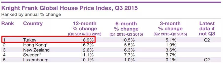 房地产是土耳其的支柱产业,占国内生产总值的9%左右。在过去几年里,土耳其的房价一路高歌猛进,数次登上莱坊全球房价指数的前六名,2015-16年前七个季度甚至蝉联第一,全年涨幅平均在18%。最高的一次,土耳其房价一年上涨了18.9%。