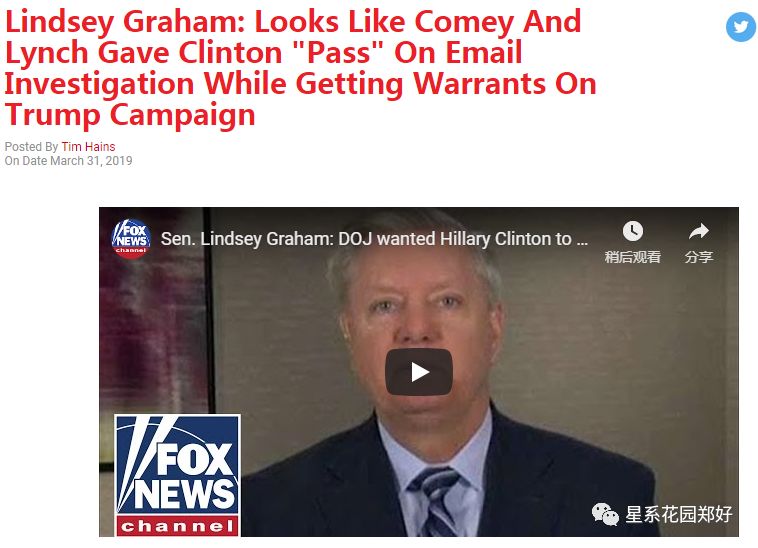 福克斯新闻今日报道视频链接如下https://www.realclearpolitics.com/video/2019/03/31/lindsey_graham_looks_like_comey_and_lynch_gave_clinton_pass_on_email_investigation_while_getting_warrants_on_trump_campaign.html