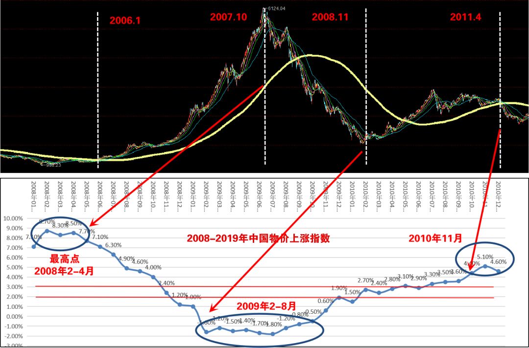 当物价指数第一次达到3.0%的时候,那么后面半年基本上肯定在3.0%以上,那时就意味着经济过热,经济过热后必然会采取加息、提高准备金率等措施——所以在物价指数大于3.0%的时候一定要出来!
