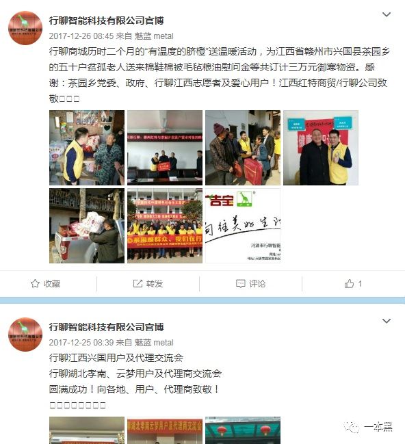 行聊2017年发布的一条微博中曾写道,团队历时两个月在江西地区送出了价值三万块的物质。一手招商,一手慈善。好得很。