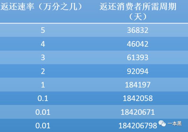 下图是云联惠的的返还时间,万分之五的返还速率,想要拿到10000块大概需要100年。广告宝的返还速率为0.25%,具体时间,自己算算吧。