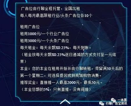 一个行业广告位的月租金是1000,能收租700块;头条广告位3000,可收租金2100。租金按天返还到用户账上。