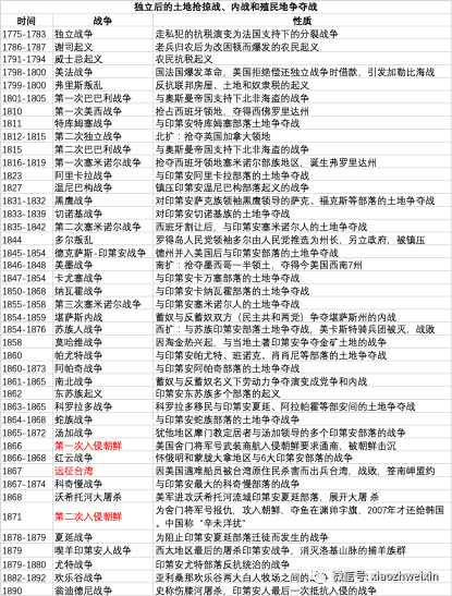 英法7年战争当然是表现为争夺殖民地的战争,延伸到美洲就是1754-1763的美洲殖民地争夺战,法国战败。通过第一次巴黎和约,法国割让了北美全部的殖民地。英国成功占领几乎整个北美。法国虽战败,可心里当然不服气。于是鼓动英殖民地的那些英国移民起来造反。殖民地当然有很多不太服从英国统治的刺儿头,尤其是那些正在绕开英政府从中国和印度搞走私贸易的走私犯们。双方一拍即合,这就有了所谓的独立战争。标志事件是走私犯们鼓动新格兰移民抢掠英国东印度公司的商船,将其茶叶倒入大海,上演了所谓“倾茶事件”,引发所谓独立战争。注意,那些所谓的美国开国先贤们,当初其实都是走私犯。所谓独立战争的本质,不应该叫独立战争,而应该叫分裂战争。如果是印度这样的英殖民地从英国统治下独立,这当然叫独立战争。可美国是英国自己的移民想从自己的祖国分裂出去,这怎么能叫独立战争呢?只能叫分裂战争。美国从英国分裂出去后,发生的战争可比英国多太多了。不仅对印第安人是无休止的杀戮和抢夺,对英国还占着的北美地盘也是不断地抢夺,对西班牙的地盘也丝毫没有客气。下表是美国从英殖民地分裂出去后,直至1890年的大约100年时间里发生的主要战争统计。一是美法战争。法国是美国独立战争的武器和资金援助者,可以说,凭当时英国的实力,没有法国的背后支持,美国独立几无可能。可是,法国因为同英国的7年战争以及支持美国独立战争而耗空了国库,导致国内民怨四起,在英国的撺掇下也发生了内乱,爆发了法国大革命(1789)。此时,当大力支持和援助了美国独立战争的路易十六向美国求援时,美国却充耳不闻,眼睁睁看着法王被送上断头台。新上台的法国政府向美国追债,美国同样拒绝还钱,理由居然是只向法王借过钱,没向新的法兰西共和国借过钱。于是双方也打了一仗。法国内乱不断,不能久战,让美国既赖掉了债务,又赢了战争。所谓第二次独立战争更有趣。分明是美国从英国分裂出去了,占了英国15个州的地盘,这美国人还不满意,趁英国忙于亚洲事务,在北美地区(加拿大地区)驻军少,又跑去抢英国人的地盘。结果英国人在加拿大民兵和印第安人的帮助下把美国人给打败了,最终总算是守住了今天加拿大那一块地儿。这印第安人为什么要帮助统治他们的英国而不帮助美国呢?原因就是英国对印第安人比美国人要好点。这种抢掠战争,居然会被称为“第二次独立战争”,有意思吧?美国人撒流氓是有历史的,可别小看了。所谓南北战争当然更有趣,只是我过去讲过很多次,在这就不多啰嗦了。简单点说,南北战争的实质是:流氓为夺取政治权力,扛起道德大旗,干了违背宪法的勾当,悍然发动了不义战争,最后居然还成了民族英雄式的伟大总统。要知道,在当时,蓄奴制度和公投独立都是受宪法保护的,南方各州并没有什么错。林肯代表北方工业基地的新兴资产阶级利益,想要抢夺南方的黑人劳动力,以解决工业劳动力严重不足的问题。扛着自由和人权的道德大旗,悍然发动内战,导致人口死亡超过5%,林肯其实犯下了滔天大罪。何况,林肯扛着反蓄奴的大旗,自己家里却也蓄有黑奴,这种为政治权力而不择手段的伪君子居然成了美国历史上最伟大的总统之一,实在就是一个笑话。美国历史上也曾入侵过台湾和朝鲜的,这一点估计很多人都不知道。至于美国入侵墨西哥,抢掠了墨西哥一半国土,成为了今天美国西南7大州,包括最富裕的加州,这点历史想必大家都知道的。千万别再说美国不曾侵占别人一寸土地了,历史事实可不是这样的。今天美国的大部分土地可都是侵占的。这里还不是全部,往后的历史中,还在继续侵占,我们往下看就知道了。至于美国独立后血腥而残酷地抢掠印第安人土地,屠杀印第安人的战争历史,上面其实也并非全部,只是很小一部分。因为太多,罄竹难书,我就不去罗列了。大家注意一个有趣的现象,今天我们耳熟能详的许多名词,比如阿帕奇、切诺基、纳瓦霍等,其实都是曾经被美国人消灭的印第安部落名称。美国人不忘历史,永远记得炫耀他们攻城掠地的伟大功勋。只不过,就如同“感恩节”的故事一样,他们的伟大里永远要将印第安人踩在脚下。他们记得“五月花号”到达普利茅茨后,饥寒交迫中曾经受到过印第安人的救助,终于有人存活了下来。但是,他们要通过“感恩节”来感恩上帝派人给他们送来了火鸡,而不是感恩印第安人送来了火鸡。这就是伟大的美国人,伟大的盎格鲁-撒克逊人。03